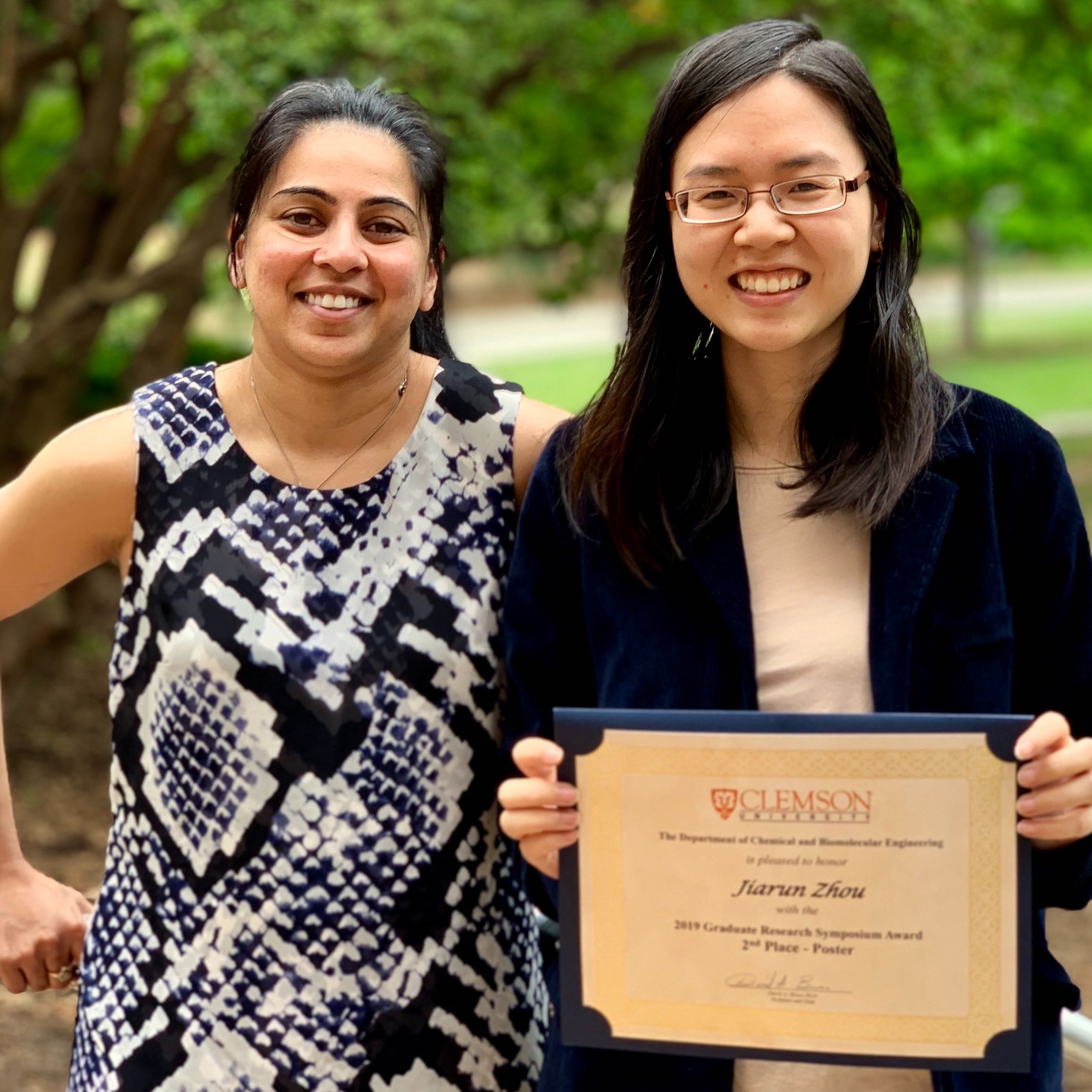Jiarun Zhou won the award for Best Oral Presentation - 2nd place at the annual symposium of the Chemical and Biomolecular Engineering department, Clemson University. Also, Zhou has won an award at every ChBE symposium she has participated in. Congratulations, Zhou! We are proud of you!