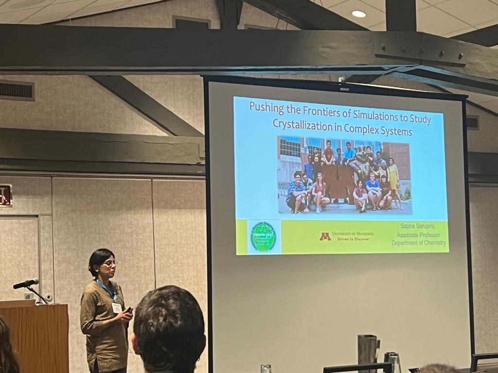 There, Dr. Sarupria gives her talk "Pushing the Frontiers of Simulations to Study Crystallization in Complex Systems", which showcases our group's work on ice nucleation on mica and different rigid seeding techniques. Whereas, Naomi presents her work on "Analysis of Aqueous Cation Transport through Zeolites for use with Forward Flux Sampling".