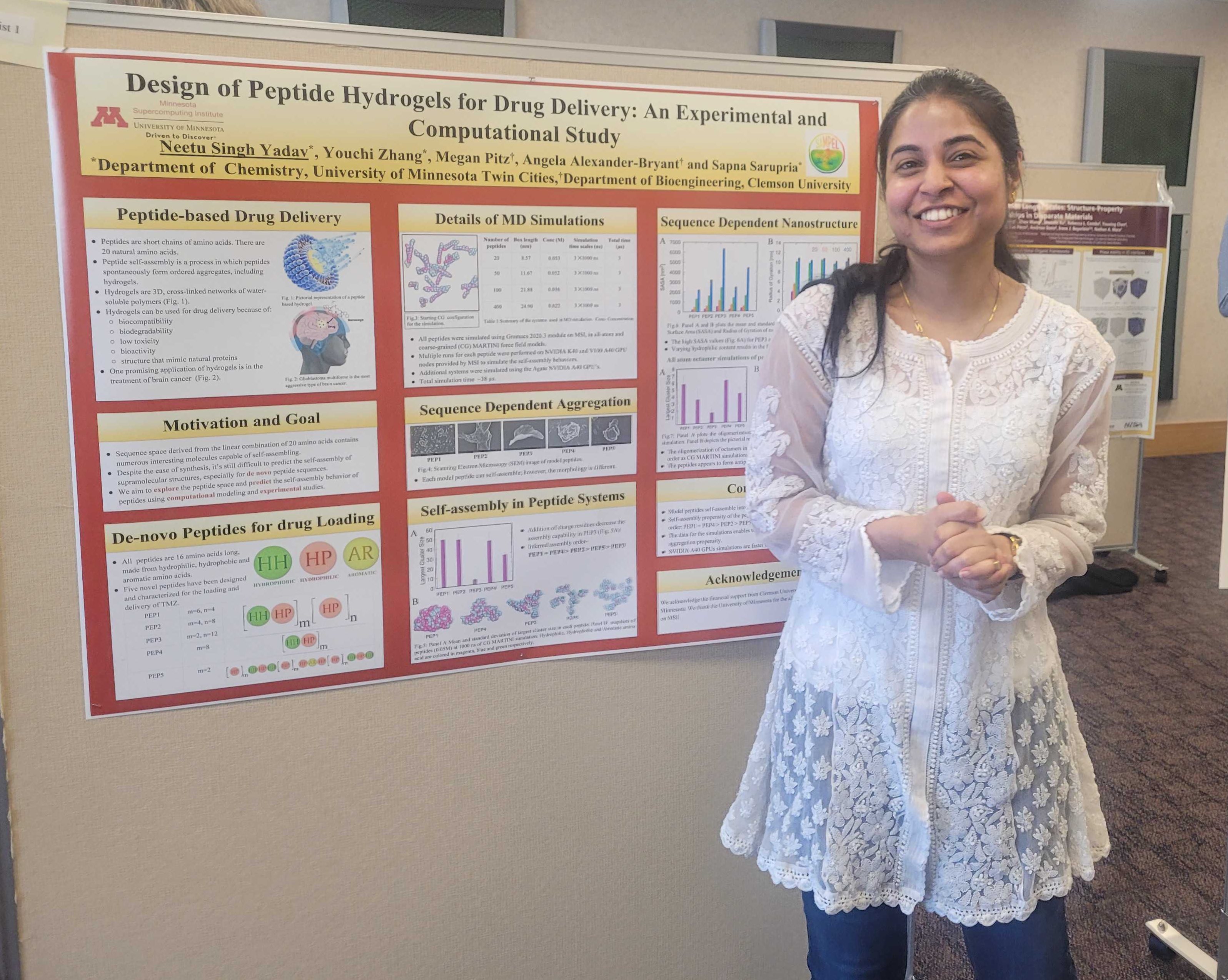 The 2022 MSI Reserach Exhibition is an exhibition that showcases the Univeristy of Minnesota's supercomputing facilities (MSI) contribution towards the scientific project. There, Neetu presented her work on biomaterials design for drug delivery, where she was selected as a finalist and won a travel award.