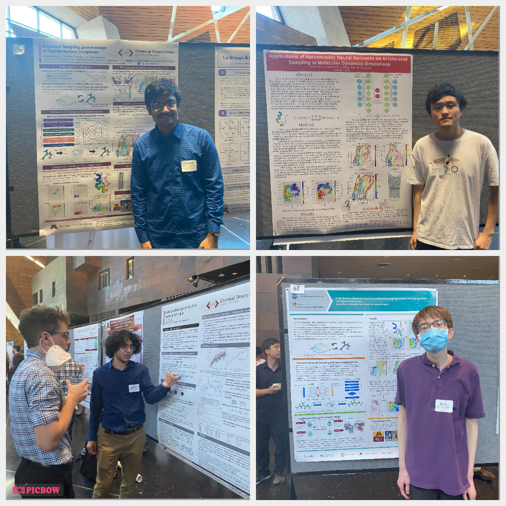 Aniruddha, Brian, Cameron and Daniel successfully concluded their summer undergraduate research with our group and presented their spectacular work at the Undergraduate Poster Symposium. There, Aniruddha, Brian and Daniel each presented on their project: Data-driven Autoencoders for Accelerated Sampling of Adsorbed Polypeptide Configurational Space, and Cameron showcased his study of TIP4P ice nucleation dynamics via the seeding method.