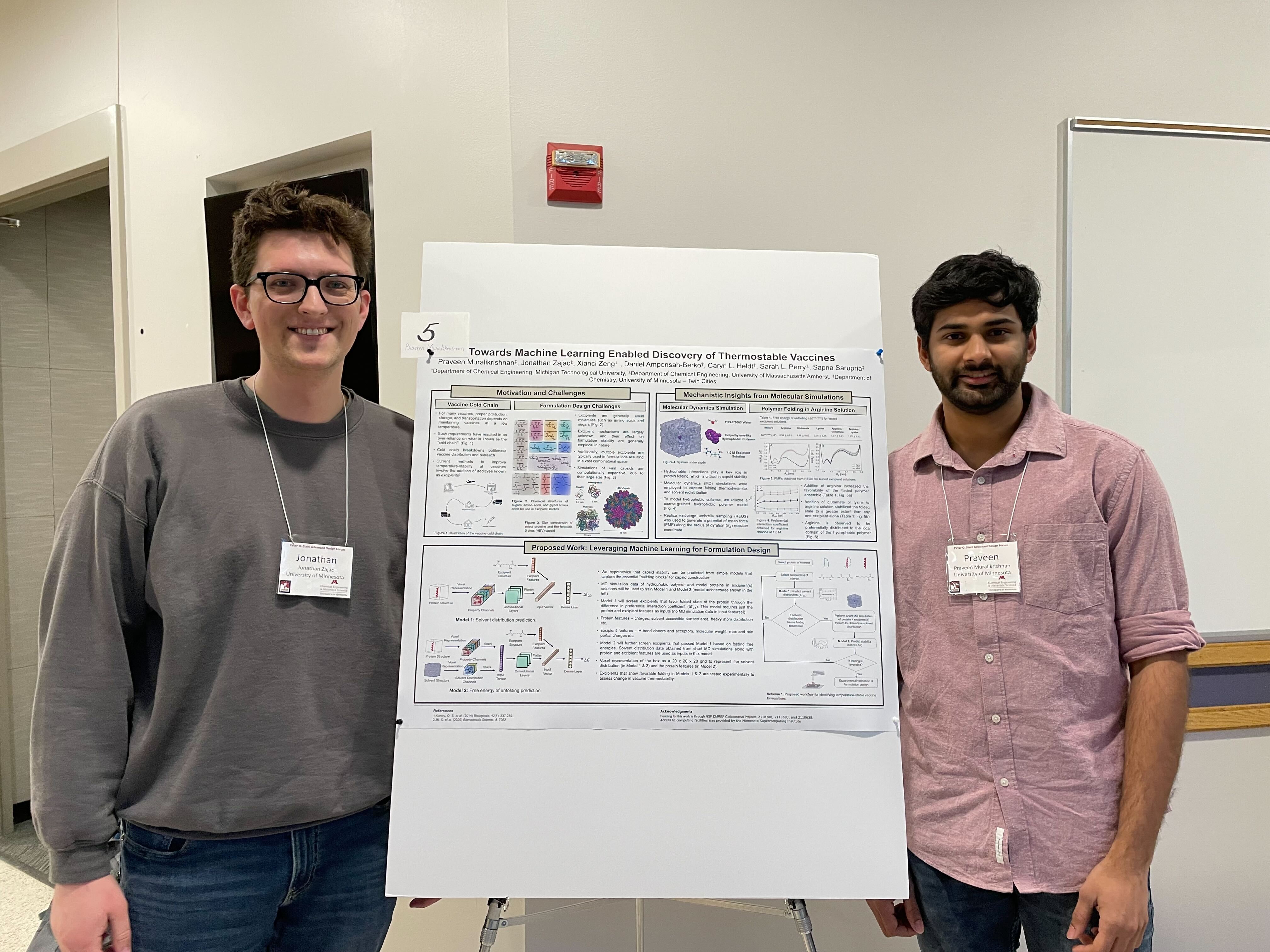Jonathan and Praveen presented their poster "Towards Machine Learning Enabled Discovery of Thermostable Vaccines", at the Peter O. Stahl Advanced Design Forum, which detailed their current work on amino acid excipients and their proposed future work utilizing machine learning models.