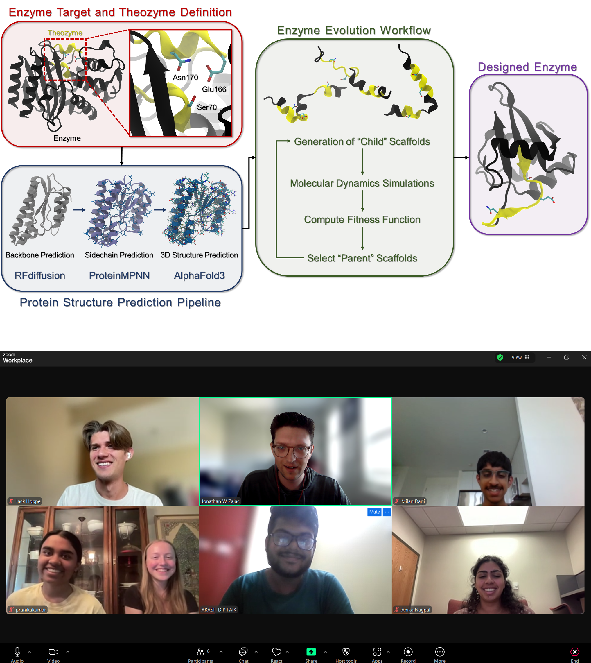 Together, everyone is working collaboratively with Jonathan on developing a novel computational framework for evolving efficient enzymes by integrating generative diffusion