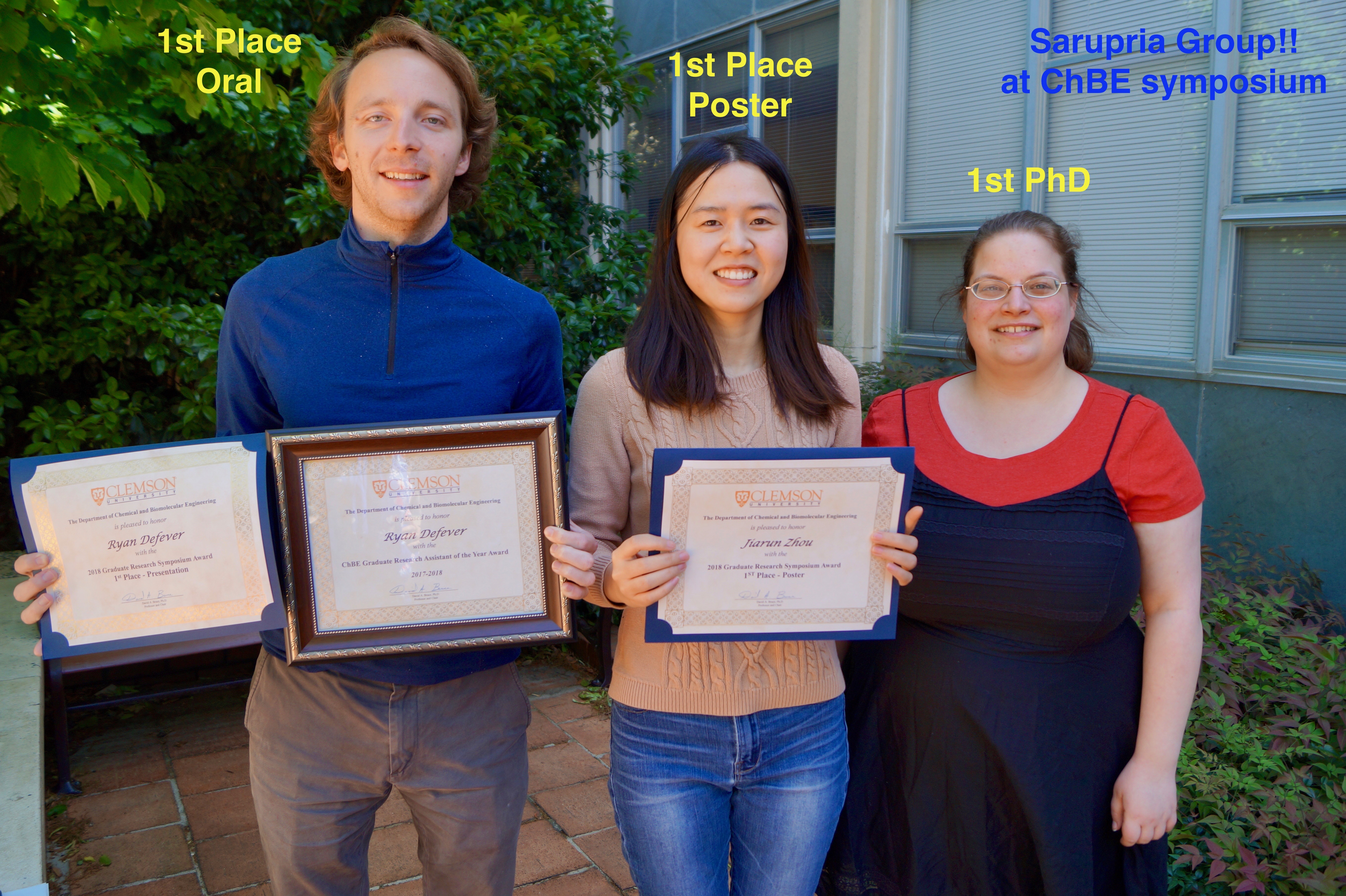 Ryan DeFever won the best oral presentation award and Jiarun Zhou won the best poster award at the annual symposium of the Chemical and Biomolecular Engineering department, Clemson University.